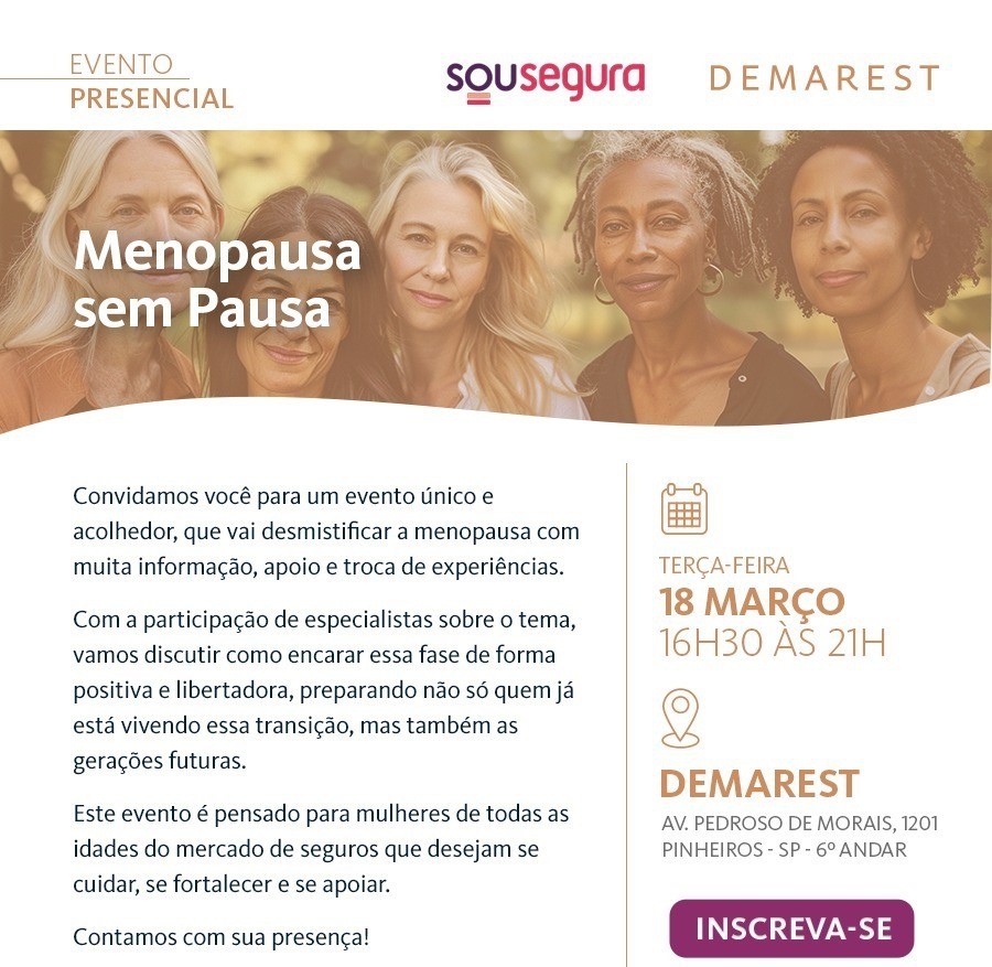 A Sou Segura e o escritório Demarest irão promover, dia 18 de março, em São Paulo, um evento presencial sobre o tema “Menopausa sem pausa”. O debate, que terá como moderadora a superintendente executiva de Comunicação e Marketing da CNseg, Carla Simões, será realizado no auditório do Demarest, das 17 às 21 hs.